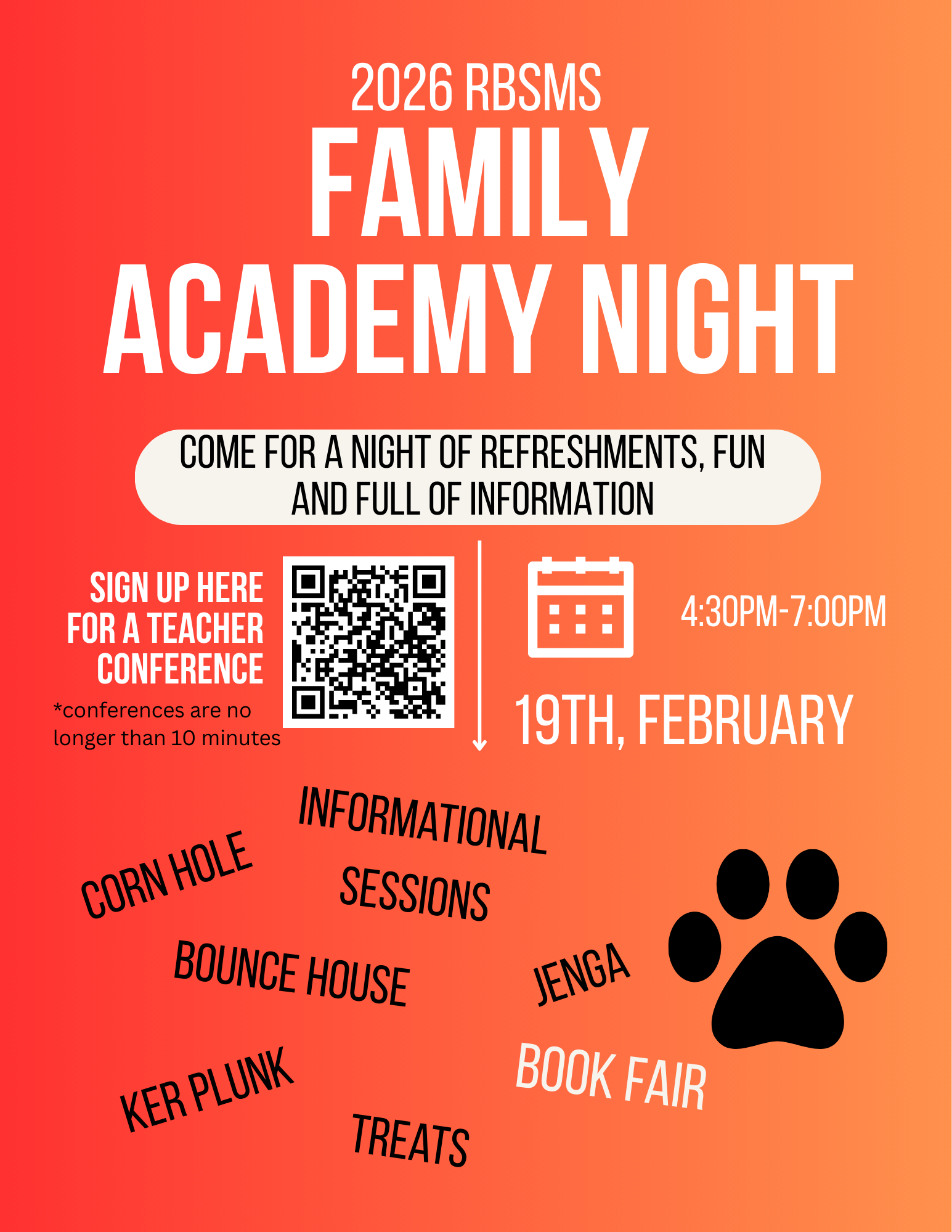 Family Academy Night Feb. 19th Sign up for a parent/teacher conference. Spots are filling quick. Bring the whole family for refreshments, games, treats and so much more.