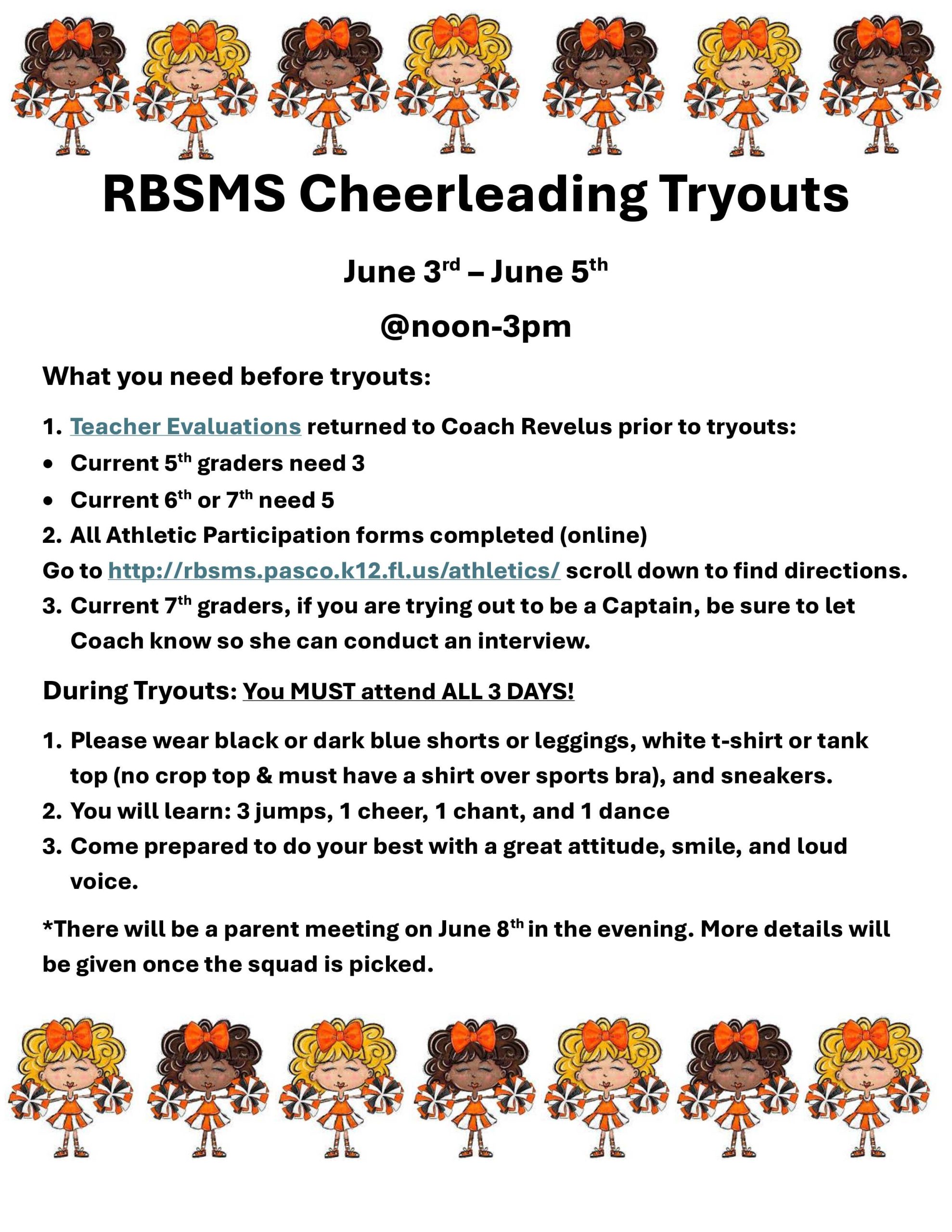 Anyone interested in trying out for the RBSMS Bulldogs Cheerleading Team please see the attached flyer. Tryout paperwork is located at the link below. Please bring complete and uploaded all paperwork & video certificates to AthleticClearance.com BEFORE coming to tryouts. Contact Coach Revelus at crevelus@pasco.k12.fl.us if you have any questions.